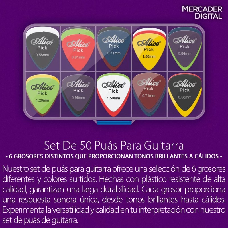 Experimenta la versatilidad y calidad en tu interpretación con nuestro set de 50 púas para guitarra.