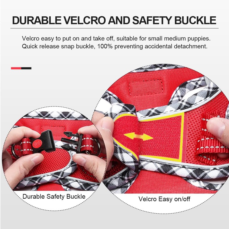 - 【Easy to use & Quick release】- Our Step-in harness is very easy to put on and take off with the fast-release safety buckle. Put the dog's front feet into the holes, close the magic tape fastener, then snap the buckle, attach the leash to D-rings, finished.