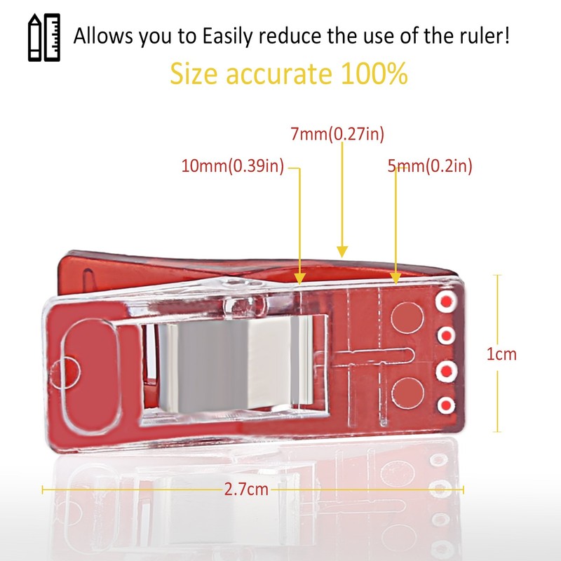 - The flat base of each clip has 5, 7 and 10 mm markers, so you can measure how far the clip reaches the edge of the fabric.