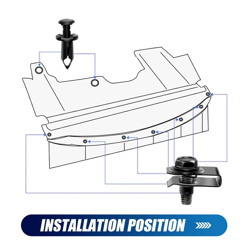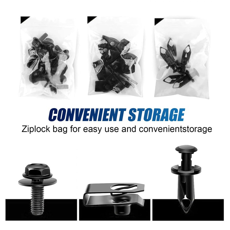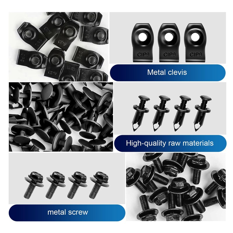 - Package Includes: 35 x under-hood splash guard body bolt screws. There are 10 x nylon push clips, 15 x body bolts with built-in fender washers, 10 x squeeze U-nuts. Suitable for most car body fastening kits.