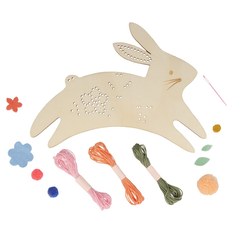 - WOODEN BUNNY. The bunny is crafted from plywood, with holes for the embroidering. The kit includes a Includes a pink plastic wide needle.