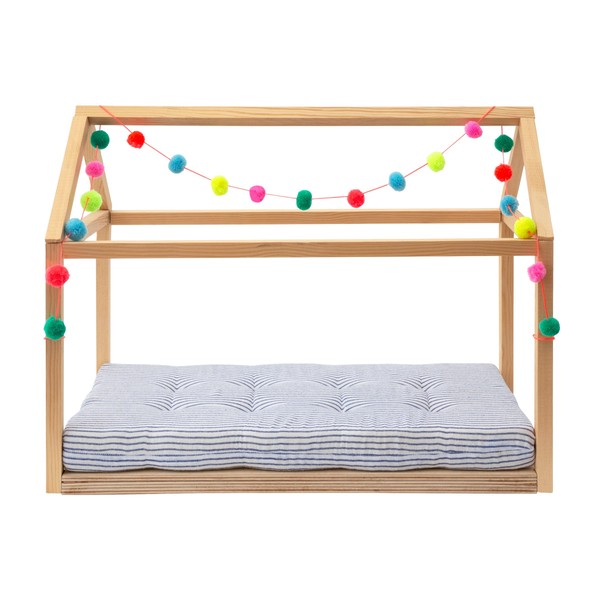 Let a favorite doll's sleep commence in style with our sensational wooden bed frame. Comes with a pretty pompom garland, to add a colorful on-trend touch, and a comfy stripy mattress. Flat packed wooden bed frame. Cotten covered foam mattress. Yarn pompom garland decoration. Product dimensions: 19.5 x 14.25 x 9.5 inches