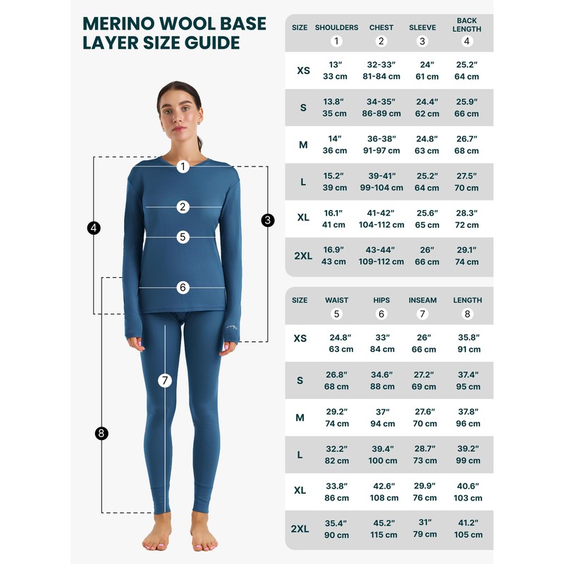 - Breathable: For longer lasting wear, hand wash and lay flat to air dry. Womens merino wool base layer top and bottoms set naturally regulates body temperature to keep you comfortable all year round.