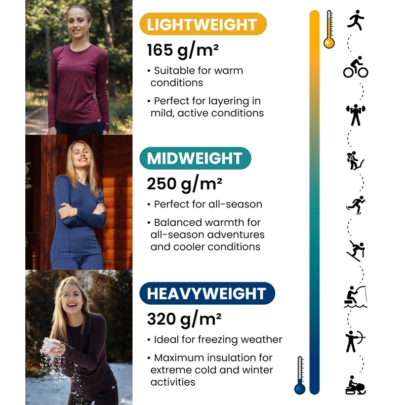 - Lightweight: Womens Merino Base Layer Available in: Lightweight 165 g/m², Midweight 250 g/m², Heavyweight 320 g/m². Merino Wool Hiking Socks ($21 Value!) - Package includes Merino Wool Base Layer Women Wool Leggings Lightweight 165 g/m² and Merino Wool Hiking Socks. Cool Packaging! Makes A Great Gift!