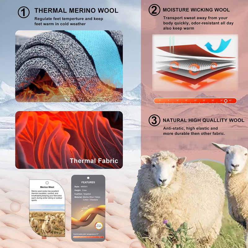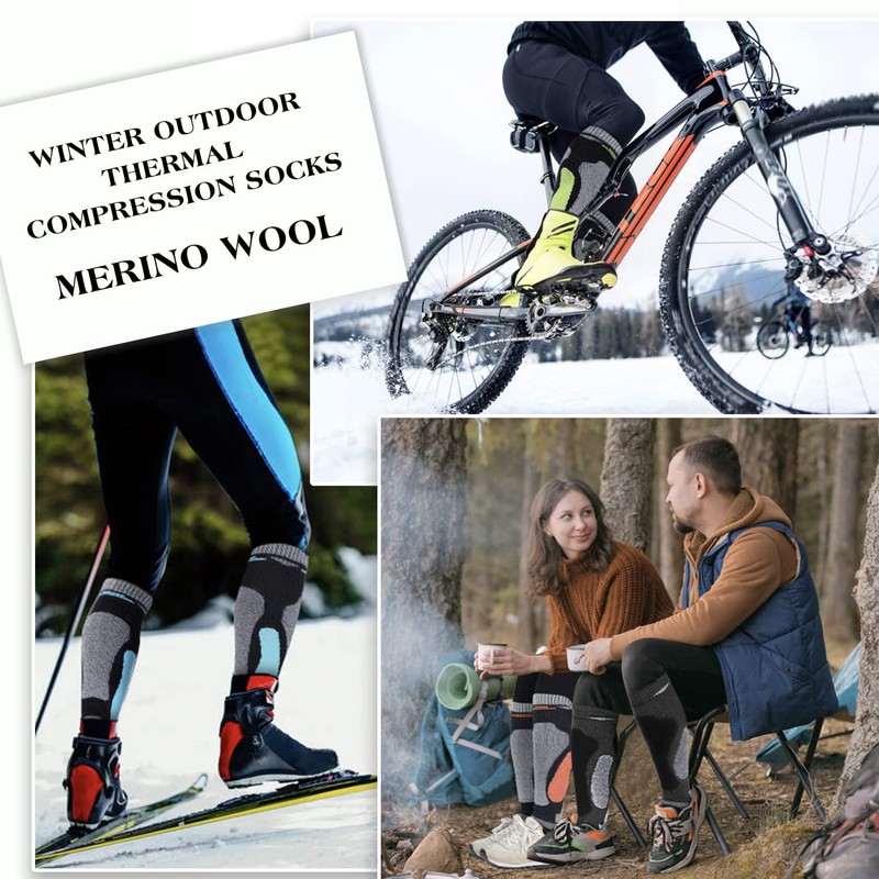 - WARM MERINO WOOL SOCKS: High Performance thermal socks are made of natural Merino wool to create the most warm temperature-controlled and comfortable ski socks. Merino wool natural temperature regulation and antibacterial properties ensure that your feet feel comfortable and warm when wearing ski boots and hiking boots. Especially designed for skiing or snowboarding, hunting, trekking, cycling, long hiking, camping, ice fishing or participating in winter sports.