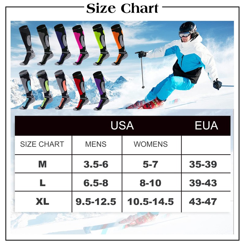 - WINTER KNEE HIGH THERMAL SKI SOCKS: Cold weather and long-term exercise can cause strains and cramps. These thick, high-quality compression socks are specially designed for winter. Thick terry loops are used to minimize the friction between the feet and the boots. The cushioning and padding in the tibial area can provide high comfort and reduce the risk of blisters, pain and vibration, giving you a full range of Bring warmth while protecting your feet.
