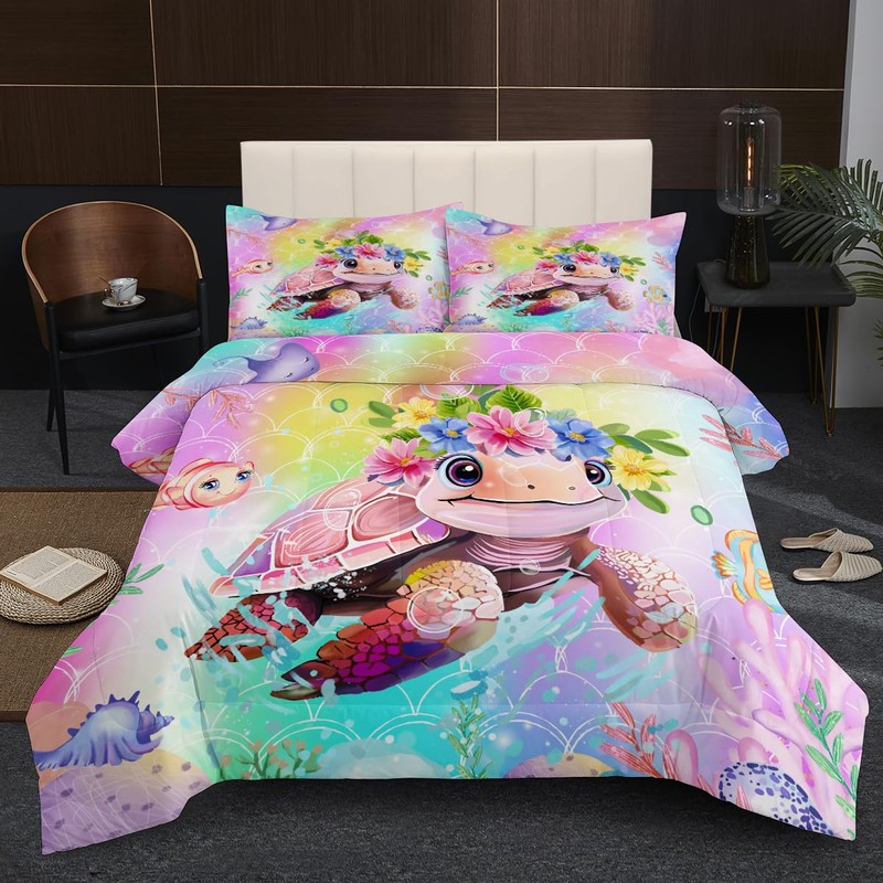 Mermaid Scale Bedding Comforter Set Queen Size,Ocean Turtle Quilt Comforter for Teen Kids,Rainbow Fish Scale Duvet Set,Flowers Turtle Bedding Soft Lightweight Duvet Insert 1 Comforter 2 Pillowcases