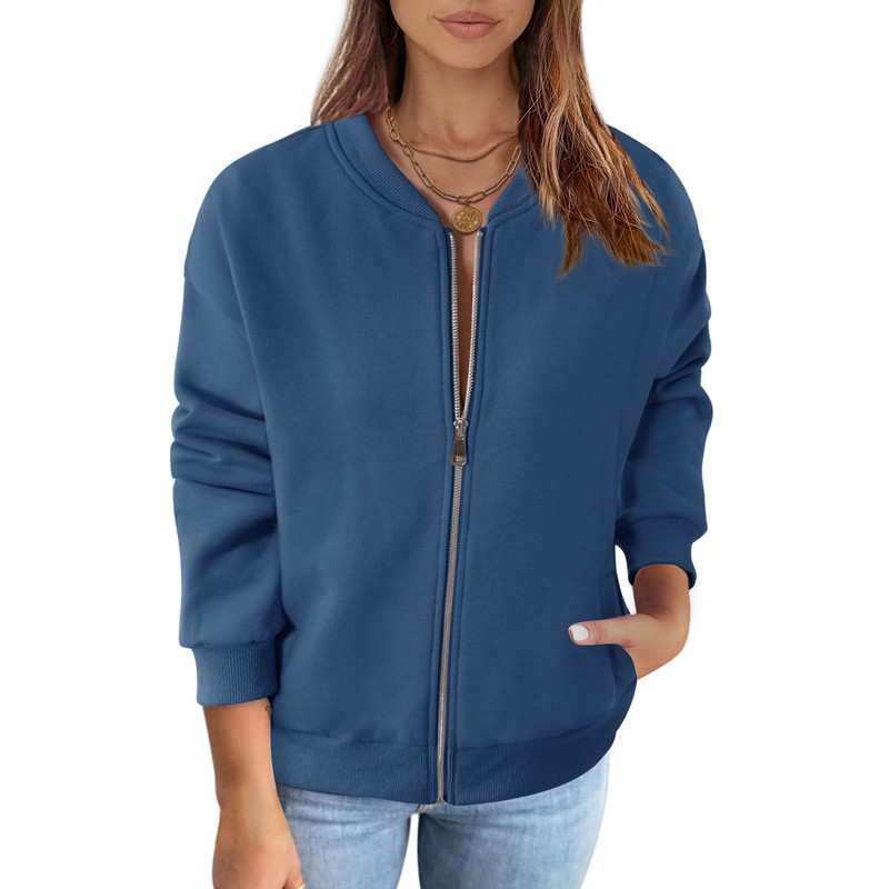 MEROKEETY Basic Zip Front Sweatshirts Crew Neck Solid Color Casual Coat Jacket for Women, DarkBlue, X-Large