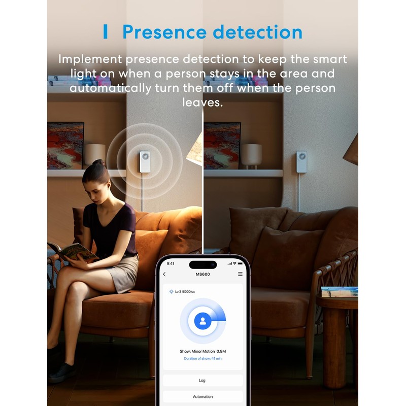 - Radar + PIR + Light Sensor The presence sensor uses double identification technology (PIR+millimeter wave radar) to avoid false alarms. Millimeter wave radar technology allows precise detection of movement in space, including the presence of people at rest. The integrated light sensor provides more flexibility and fun when creating lighting automation. Alexa does not support light sensors, the Meross app needs an update.