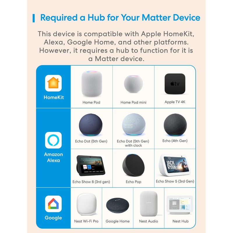 - Note: The meross motion and presence sensor is wired and requires continuous power. No hub is needed for HomeKit, Alexa, Google Home, or the Meross app. However, a hub is required for Matter compatibility.