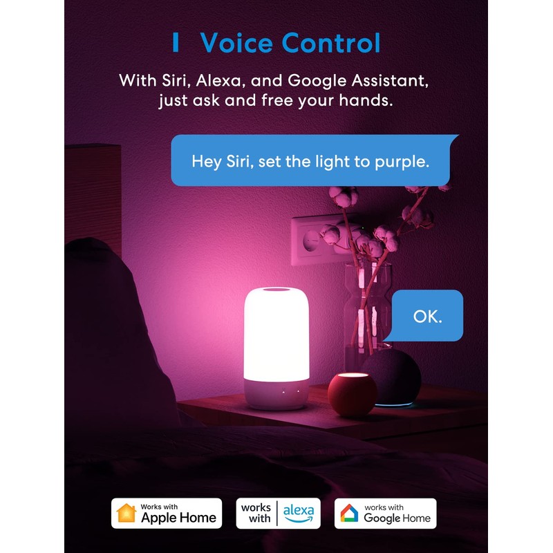• Voice control: meross RGBWW LED night light works with Apple HomeKit (iOS 13 or above), Alexa and Google Assistant to manage your devices with voice control.