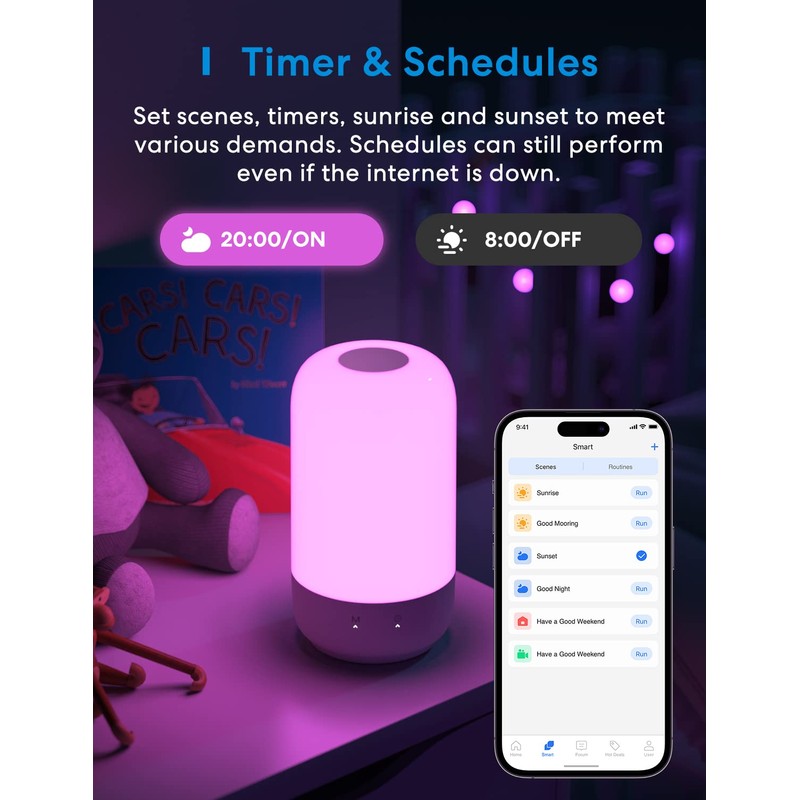 • Schedule: the nursing light stores the status setting before it is switched off and does not need to be set again. You can also set a private schedule, and the touch light will automatically turn on or off according to the preset time. Sunrise/Sunset supported. Even if the network is disconnected, the schedule continues to run (scene requires network).