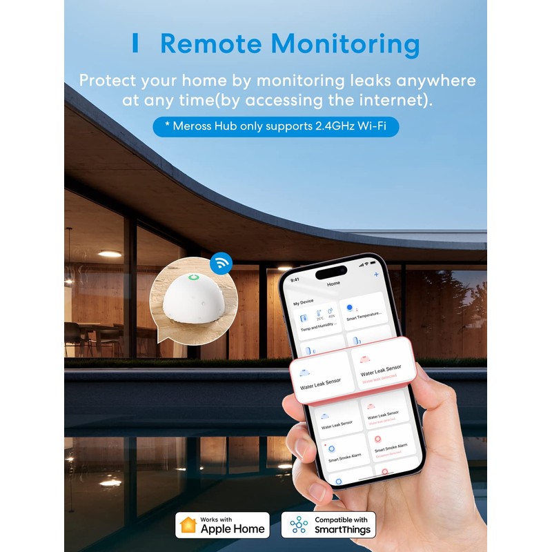 • Real-time Alert & Precise Detection: Get peace of mind and protect your home from water damage with meross water leak sensor! Just connect the hub to 2.4GHz WiFi, and you'll receive real-time alerts via email, app, and sound alerts whenever a leak or flood is detected