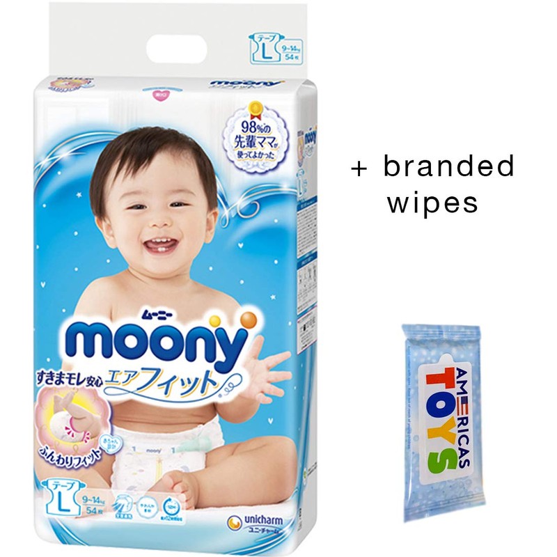 Merries Baby Diapers Large Size 54 Counts with Moony Wipes Bundle