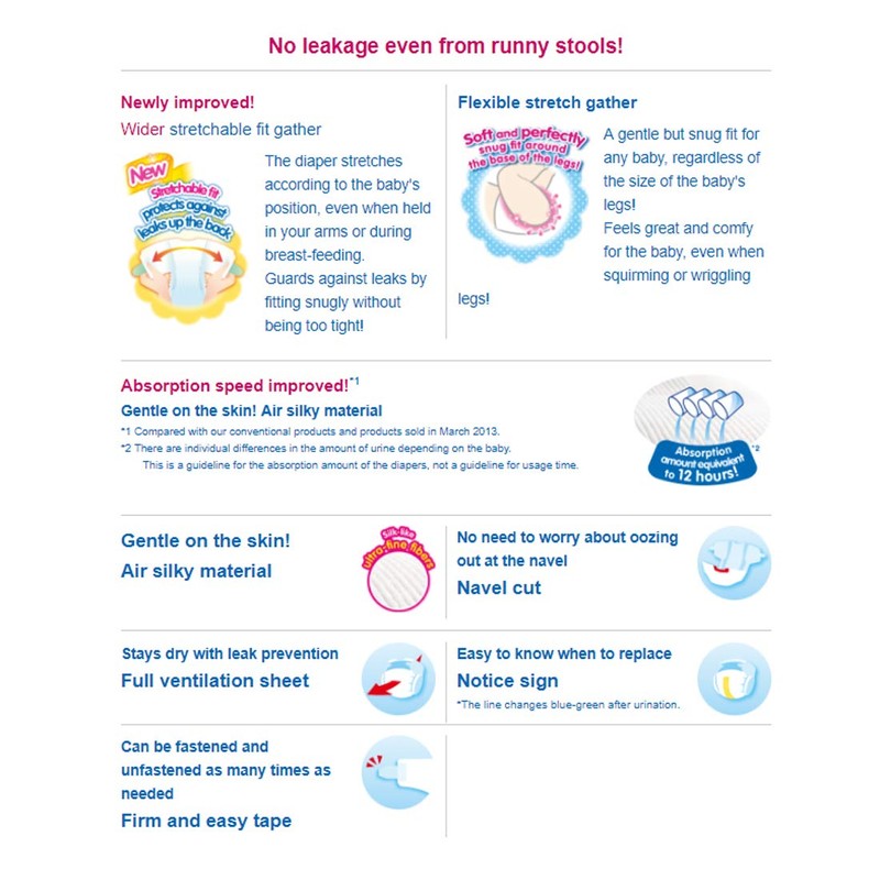 • Ultra-soft, fluffy and breathing: air soft surface contains 2 convex shapes: large and small. Large convex shape allows quickly absorb pee and poo, while small convex shape is intended for preventing spreading of poo around diaper. Both side parts are made of multiple fine waves(=convex-concave)! The wavy surface reduces the skin contact area so that it does not stick to baby's skin! Newly mounted on center part's volume-absorbent zone!