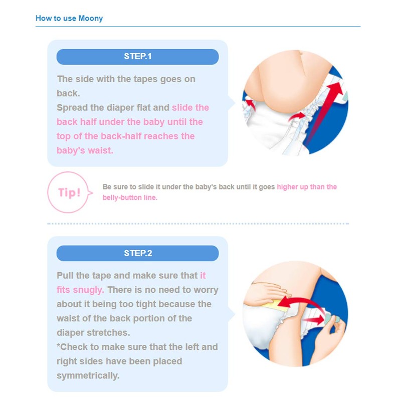 INSPIRED Moony and Moony man products have superior gentile qualities that are designed to adapt to all stages of your precious child's growth. This is why we got to the bottom of all of the care that is put into Moony and Moony man products. We will report on the inquisitive minds of the developers, and their wishes they placed in their product, for you and your baby. FEATURES: NEW TECHNOLOGY! Full-coverage high waist design! They match exactly the baby's inner thighs so there is no gap for leaks even with active babies! Super absorbent, highly breathable and ultra-soft so your active baby stays dry and comfortable! Instantly draws in and locks away pee, leaving the diaper surface drier for longer usage! Stays dry with leak prevention. Even the babies with high body temperature and tends to be sweating a lot, this diaper can keep their bottom dry! Clean-up is simple with the roll-up tape. Roll up a diaper with the dirty surface inside, and use the tape in the back to fasten. The notice indicator line will change into bluish green color, so you can know when to change diaper. Does not stick to your baby's skin so your baby stays dry and comfortable. Fit snugly in all positions, stretch gently around your baby's waist. No red marks or abrasions at the crotch area! DESCRIPTION: Moony’s unique dual channel absorbent core instantly draws in and locks away pee, leaving the diaper surface drier for longer usage. Breathable soft wavy top sheet does not stick to your baby's skin so your baby stays dry and comfortable. The airy soft gathers fit snugly in all positions. They are made with breathable soft material ensuring dryness around the waist area, where your baby tends to perspire easily. Let your active baby play in utmost comfort.