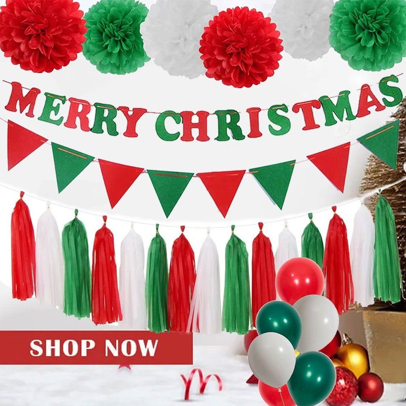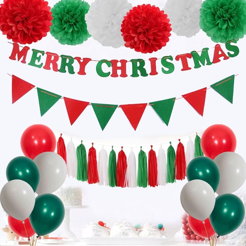 - PACKAGE INCLUDE : You will receive 6 tissue paper flowers pom poms, 1 Merry Christmas Banner, 1Pack Triangle Bunting Flags, 27pcs Christmas balloons, 15 tissue tassel garland.