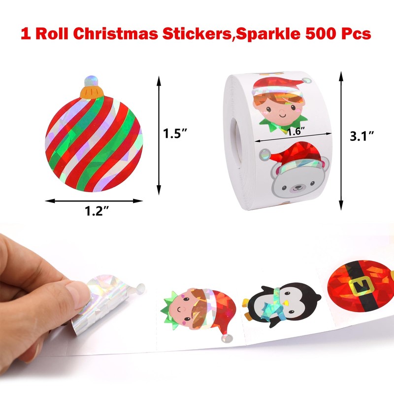 Merry Christmas Envelope Seal Stickers for Kids Sparkle Labels 1 Roll 500Pcs Holiday Xmas Party Favors Goodie Bag Fillers