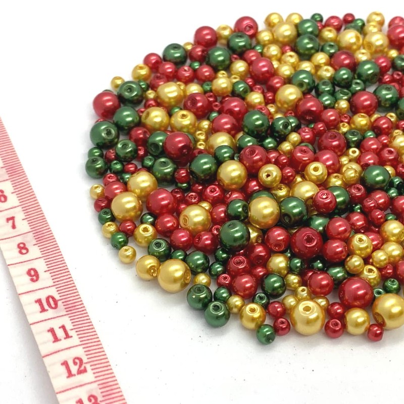 - Beautiful Mix of Red, Green and Gold Coloured Elegant Glass Pearl Beads. Cost effective and tasteful mix of Colours and Sizes.