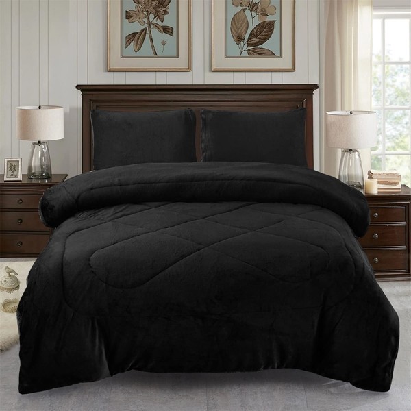 MERRY HOME Sherpa Fleece Blanket, 3 Pieces Fluffy Reversible Plush Borrego Blanket with Pillow Sham, Printed Super Soft Warm (King(79"x91"), Black)