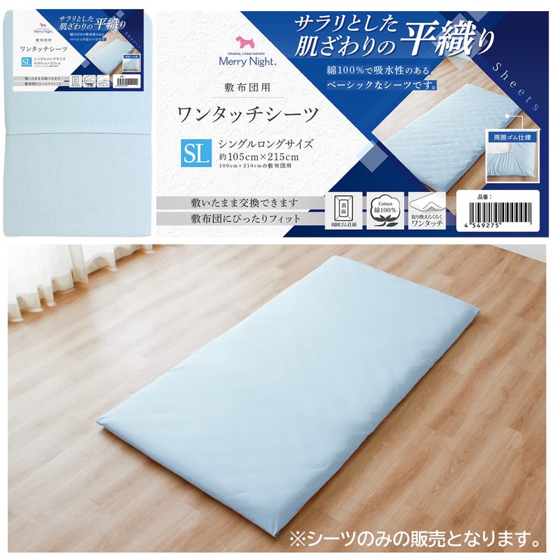 Merry Night 362001-76 Sheet One-touch Sheet Plain Weave Fabric Blue for Futon Single Long Approx. 41.3 x 84.6 inches (105 x 215 cm) 100% Cotton Basic Fabric Smooth Skin Texture All Season Washable