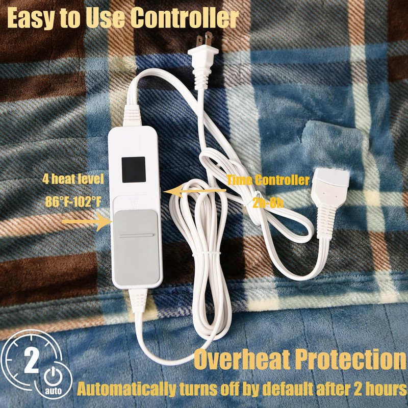 - 【Adjustable Temperature & Time Controller】Our electric blankets have 4 levels of temperature control setting(86°F-108°F), you can set different auto-off time ( 2h-8h ). When you're napping during the day or sleeping at night, it will keep you warm enough and shut off automatically to ensure safety.
