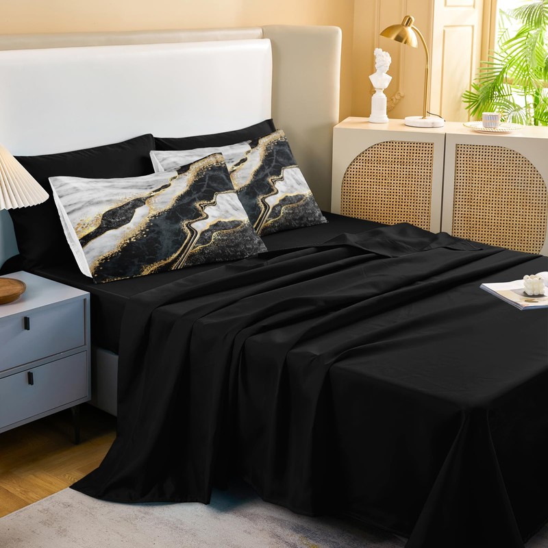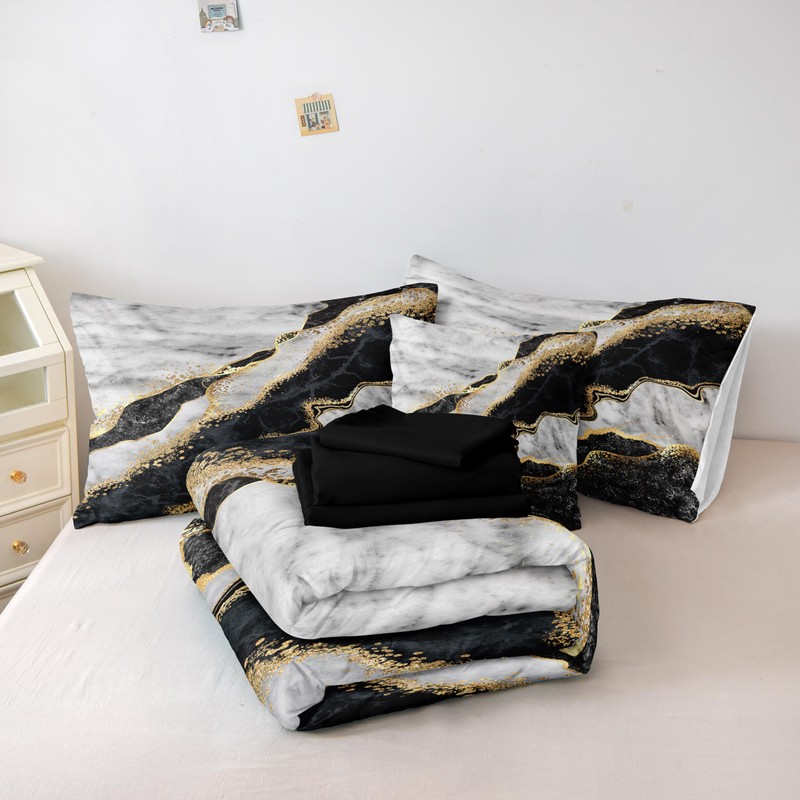 - MARBLE KING BED IN A BAG - 8 pieces sets include 1 comforter 104*90, 2 marble pillowcases 20*36, 1 solid flat sheet 110*104, 1 solid fitted sheet 78*80 ,2 solid pillowcases 20*36 and 1 marble cushion cover 18*18.