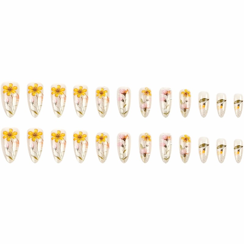MERVF Almond Press on Nails Medium Fake Nails Flower Spring Glue ons Solid Color Design Manicure Stiletto Pearls Glitter Acrylic Nail Supplies DIY Glossy 24pcs