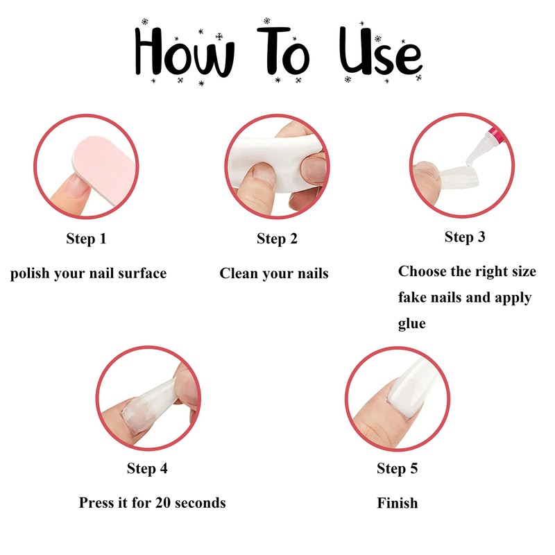 - Easy to Use--- Fake nails just choose a right size of the nail, polish the nail bed, apply glue on nails and press it for about 15 seconds. You can get a new nail by yourself without wasting time and more money at the nail salon