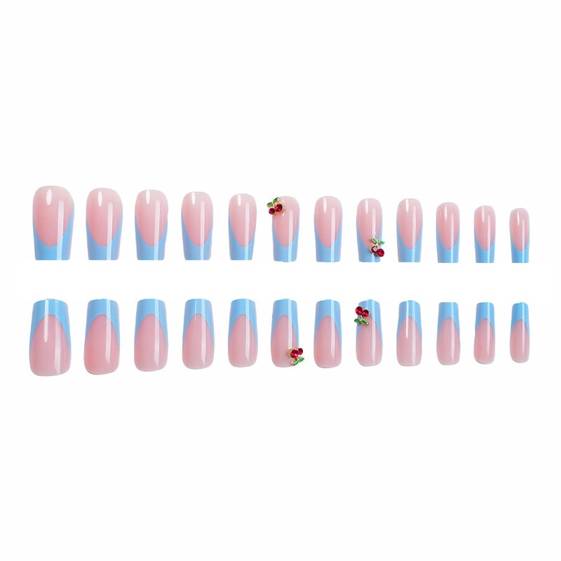 MERVF Long Square Press on Nails Blue French Tip Fake Nails Cherry 3D Charms Glue ons Squoval Summer Acrylic Nail Cute Manicure Supplies Art DIY Glossy 24pcs