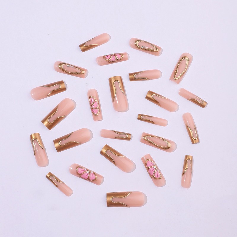 MERVF Long Square Press on Nails Gold French Tip Fake Nails Pink Flower Press ons Luxury Squoval Glue on Nails 3D Pearls Design Acrylic False Nails Glossy 24pcs