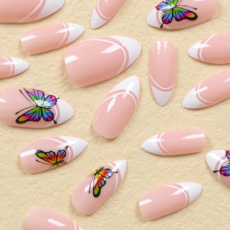 MERVF Medium Press on Nails Almond Fake Nails Press ons White French Tip Glue on Nails with Colorful Butterfly Design Stiletto Acrylic False Nails 24pcs Glossy