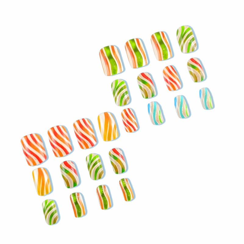 MERVF Square Press on Nails Medium Fake Nails Colorful Candy Glue ons Swirls Design Art Acrylic Squoval False Nail Supplies DIY 24pcs Glossy
