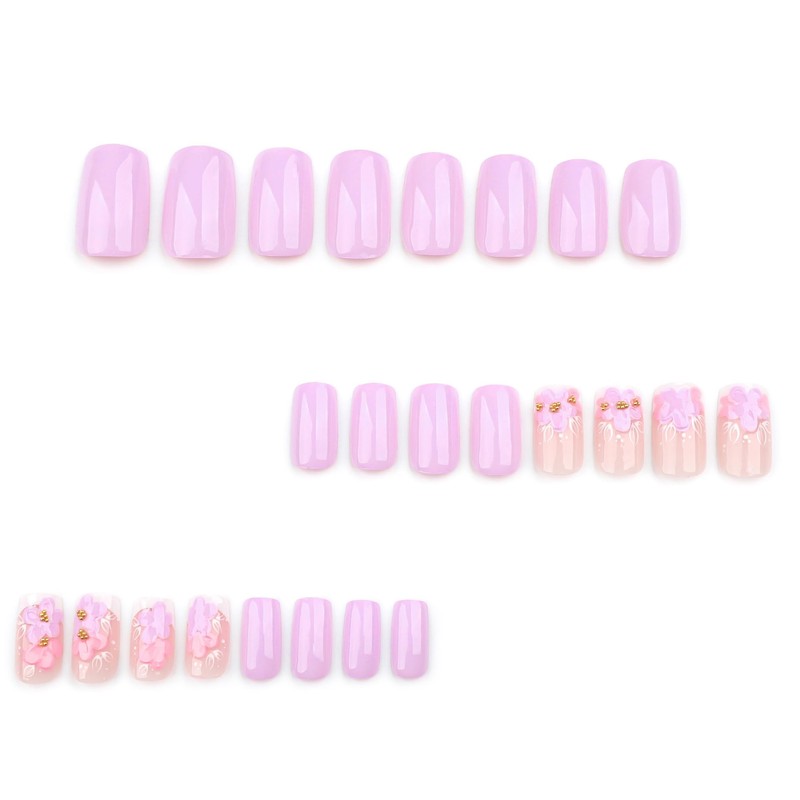 MERVF Square Press on Nails Medium Fake Nails Light Purple French Tip Glue ons 3D Flower Acrylic Nail Supplies Art DIY Squoval Manicure 24pcs Glossy