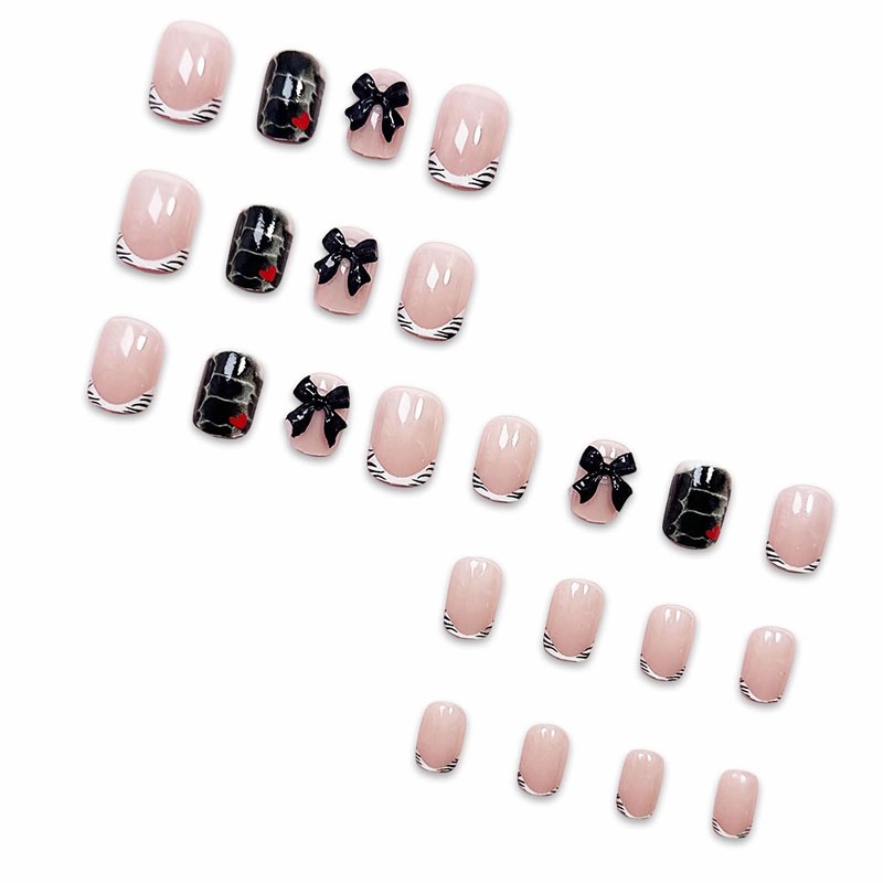 MERVF Square Press on Nails Short Fake Nail White Zebra French Tip Glue ons 3d Bow Acrylic Nails Squoval Supplies Goth Cool Art Manicure 24pcs Glossy