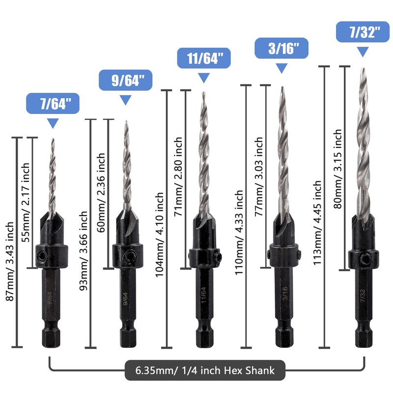 - Product Size:Shank Diameter:1/4"(6.3mm), Drill Specifications:7/64, 9/64, 11/64, 3/16, 7/32, Drill Length: 87, 93, 103, 110, 114mm