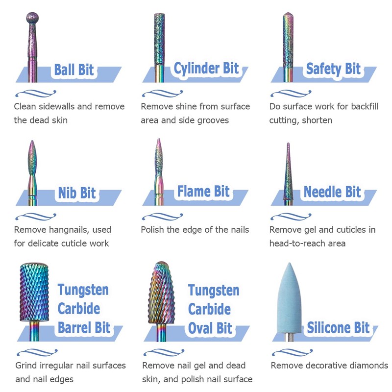 - Tungsten Carbide Drill Bits - Different nail bit designs can trim and remove the sides of the cuticle or dead skin and polish your natural or artificial nails