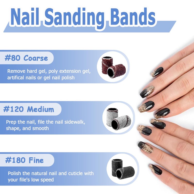 Easy to install and replace various grit sanding bands, compatible with electric or rechargeable manicure nail file machines and polishers.