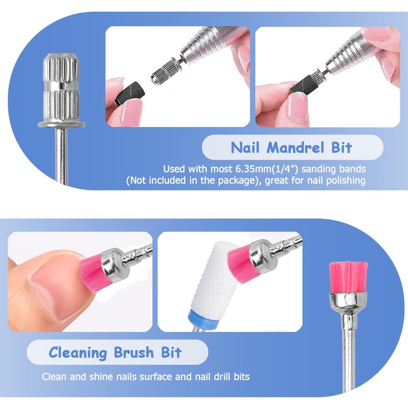 - Professional Nail Drill Bits Set - 2pcs tungsten carbide drill bits + 6pcs diamond cuticle nail drill bits + 1pc silicone nail polish bit + 1pc brush bit + 75pcs nail sanding bands