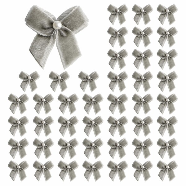 Meseey 60pcs Mini Velevt Ribbon Bows 1 Inch with Pearl Ribbon Flowers Appliques DIY Craft for Sewing, Scrapbooking, Wedding, Gift,Christmas Decoration(Silver)