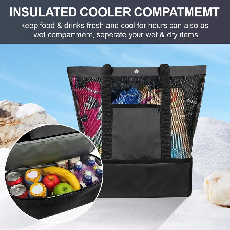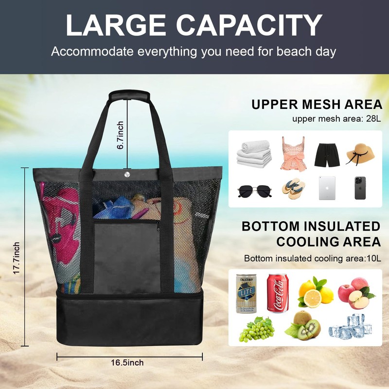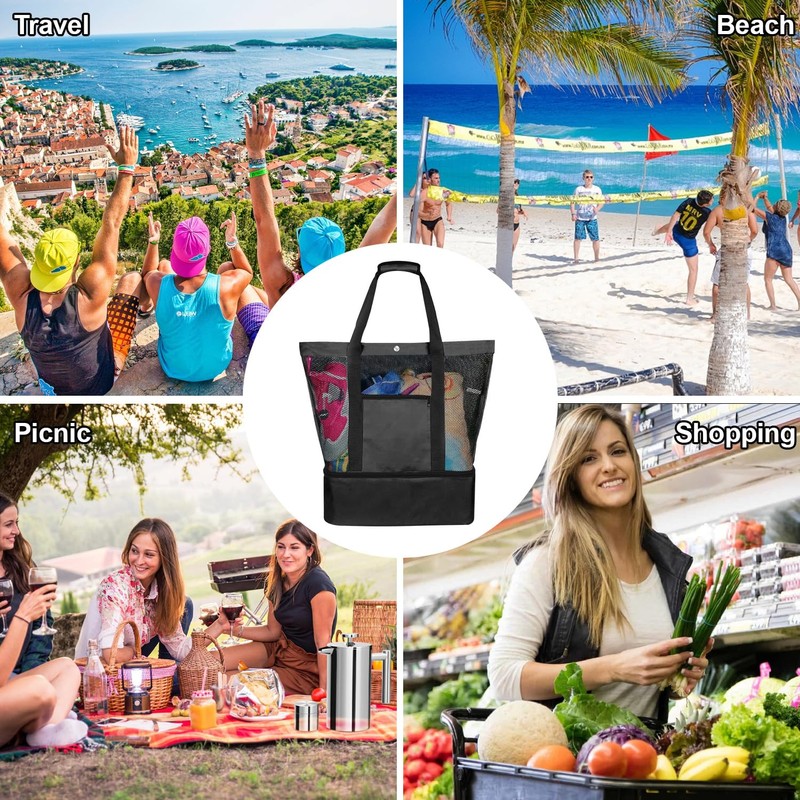 - Beach Bag with Leak-proof Cooler : This mesh beach tote bag comes with an extra cooler compartment to keep food and drinks cool and fresh, and doubles as a waterproof bag for shoes or dirty clothes, perfect for the beach, boat trips or summer vacations