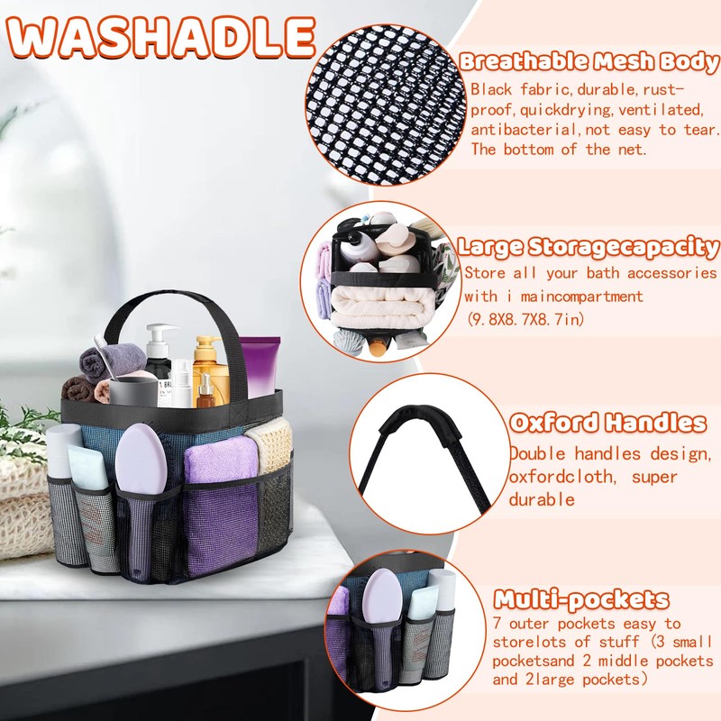 - ORGANIZED SHOWERING: Keep shower essentials tidy and within reach with this water-resistant bathroom shower organizer bag featuring multiple mesh pockets.