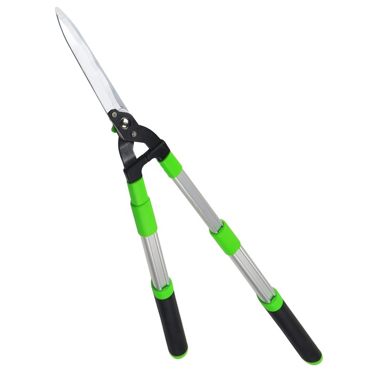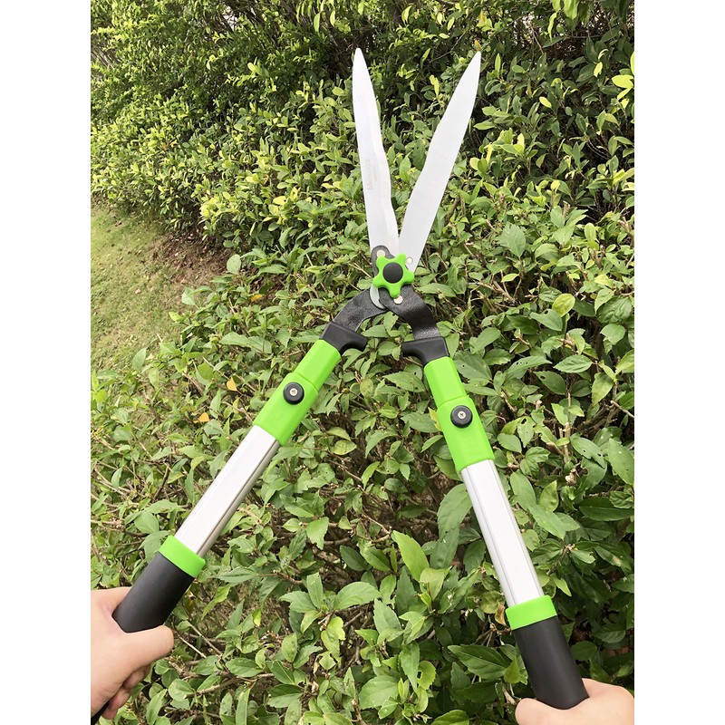 - Professional extendable hedge shears, longer handles offer versatile use, make for sturdy lightweight aluminum alloy, soft grip and non-slip improve comfort pruning shears with the safety lock 3-step telescopic handle is perfect to reach all around the bushes weeds without getting stabbed by thorns, 25 inch in closed length, 33 inch in extended length, ideal to trimming borders shrubs and boxwood