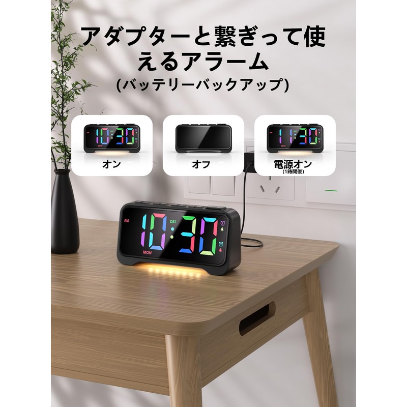 Product Features: 1. 9-color LED display, 2 alarms, snooze function, 12/24H time display, DST mode