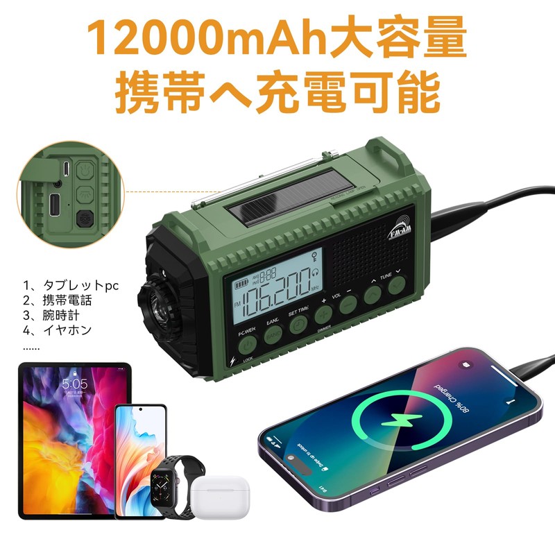 - 【5 Power Types】This hand crank radio has 5 charging options. Built-in 12000mAh Li-ion rechargeable battery maintains all functions of the solar energy radio. The 5V USB cable (adapter not included) provides the most efficient way to recharge your portable survival radio in daily use. Hand-winded, solar panel and 3 AAA batteries allow you to run your weather alert radio even in power outages or when batteries run out. Great for hiking and camping. No need to worry about running out! "