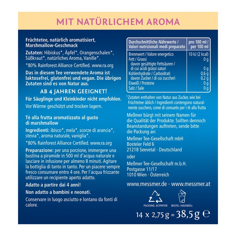 - Delicious fruit tea for in between: marshmallow flavour, no added sugar - ideal for school, sports and leisure.