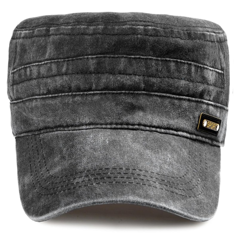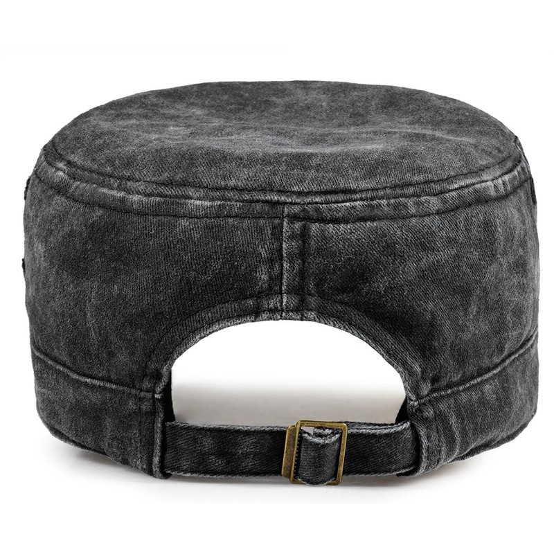 - Flat Top Military Cap, Vintage Washed Denim Cotton Army Caps, Fashion, Casual , Sporty, The Cap Visor to give your head and face protection against sunburn for outdoor activities; Clean simple and classic cap, Low Profile Solid Color, Human body engineering design, 3D tailoring, fashion, casual and classic. Efficient Absorbment, widening sweat band, good Breathability, Soft and Comfortable.; There are vents on the top of the hat; Sturdy/ Lightweight / Durable / Breathable.