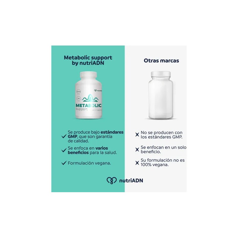 Metabolic Support by nutriADN es un suplemento avanzado diseñado para apoyar y equilibrar el metabolismo de forma natural. Con una cuidadosa selección de aminoácidos, minerales y potentes antioxidantes como el EGCG (un potente antioxidante del té verde que apoya el metabolismo y el control de peso), este producto ayuda a optimizar el funcionamiento metabólico, promoviendo un equilibrio saludable y un estilo de vida activo. Ideal para quienes buscan cuidar su salud desde dentro, Metabolic Support es una fórmula completa, libre de gluten y apta para veganos.