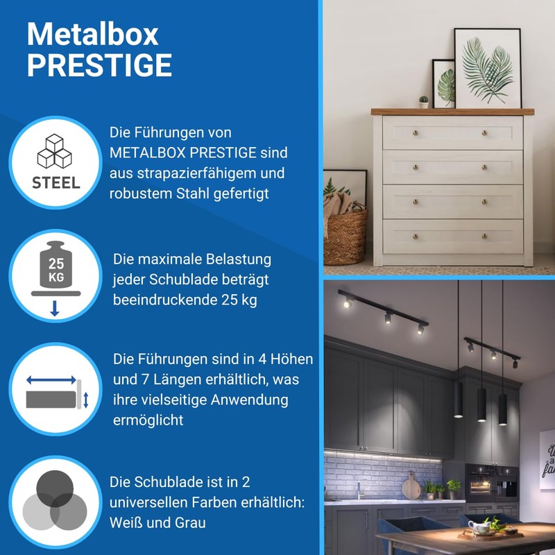 - Metalbox universal roller guides with adjustable mounting allow for use in different types of furniture: living room, kitchen, workshop and office furniture.