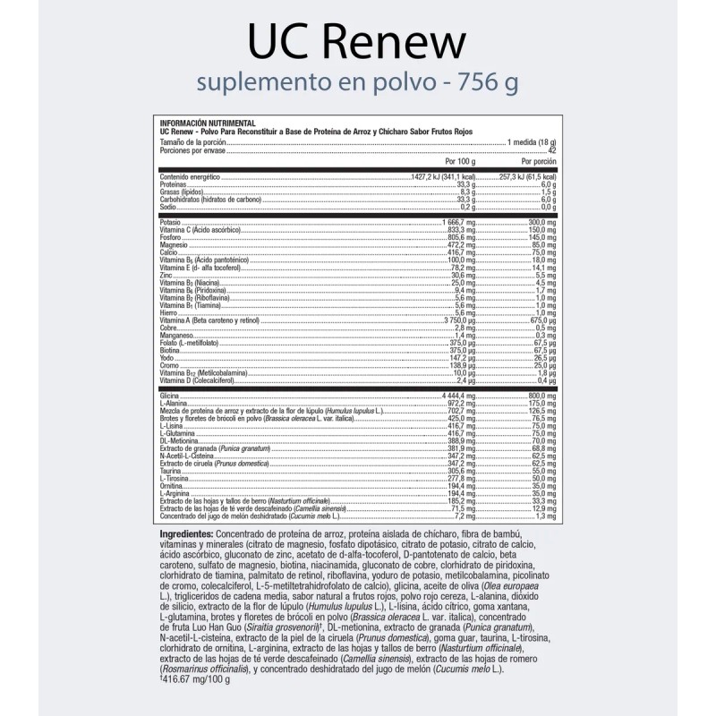 UC Renew también incluye fitonutrientes como catequinas del té verde, betacaroteno, y extractos de granada y brócoli, conocidos por sus propiedades antioxidantes. Libre de gluten y sin OGM, UC Renew es una opción limpia y efectiva para quienes buscan apoyar su nutrición y bienestar general.